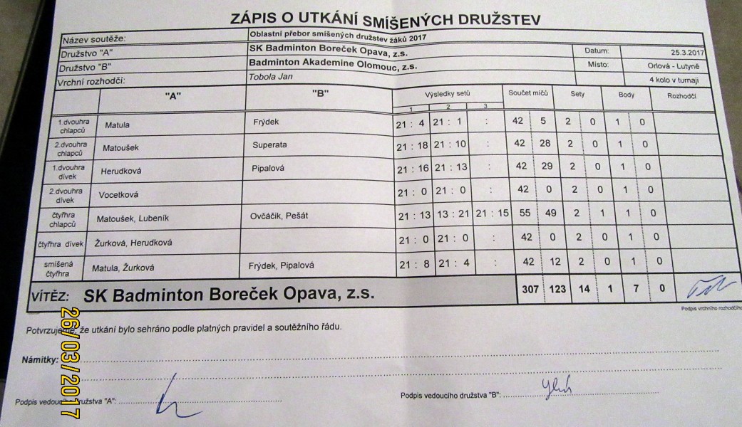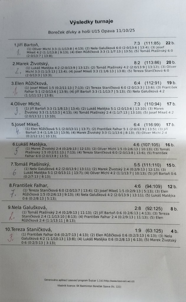 V sobotu zastupovalo Opavu 6 dětí. 4 chlapci a 2 děvčata. V kategorii U15 bojovala za děvčata Verča Musilová, která obsadila 7 až 8 místo. Lépe se dařilo Sašce Hromadové (U11), která skončila 5 až 6. V chlapecké kategorii U15 bylo zastoupení dvou chlapců a to David Musil a Ondřej Žurek. David ještě spadá do kategorie U13, takže turnaj byl pro něj důležitý pro získání nových zkušeností. Na rozdíl od Ondřeje, který jel na turnaj jako ostřílený hráč, bohužel jen o pár míčků mu uteklo 3 místo. Kategorii U11 zasupoval Matyáš Venhuda a Karel Wanke. Maty vybojoval 5 až 6 místo a největší trofej turnaje si odvezl Kája Wanke, který po těžkém boji vahrál své první zlato. U Káji nutno podotknout, že se badmintonu věnuje pouze 10 měsíců, ale tvrdý trénink, neskutečná bojovnost a touha po vítězství dopomohla k vysněnému cíli.